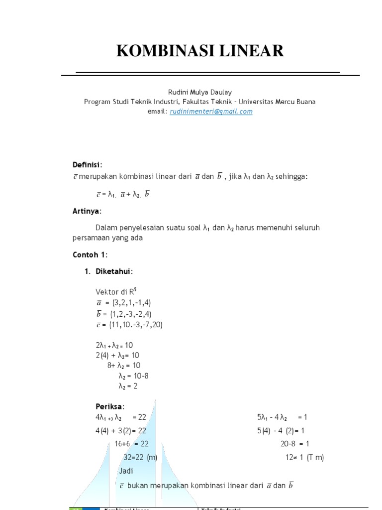 Given two vectors v and w, a linear combination of v and w is any vector of the form. Definisi kombinasi linear— transcript presentasi: Ada contoh kombinasi linear vektor pada r2, r3, dan matriks 2x2. Kombinasi linear vektor berkaitan erat dengan perkalian skalar dengan vektor dan penjumlahan vektor, sehingga kita juga akan bahas sekilas tentang perkalian skalar dengan vektor dan penjumlahan vektor secara aljabar dimana caranya sama dengan operasi pada matriks. Where a and b are scalars. Berlaku operasi penjumlahan dan perkalian skalar.