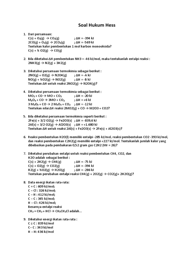Kumpulan Soal Hukum Hess Xi Ipa3 from imgv2-1-f.scribdassets.com Sobat contohsoal.co.id semua.kali ini contohsoal.co.id akan membahas materi tentang hess beserta pengertian, bunyi, rumus dan latihan soal secara detail. Hukum hess adalah sebuah hukum dalam kimia fisik untuk ekspansi hess dalam siklus hess. Beberapa reaksi kimia sulit untuk dilakukan di laboratorium. Soal #5 pada diagram berikut, kurva r diperoleh ketika 100 ml h2o2 1 m terurai ketika ditambahkan suatu katalis mno2.