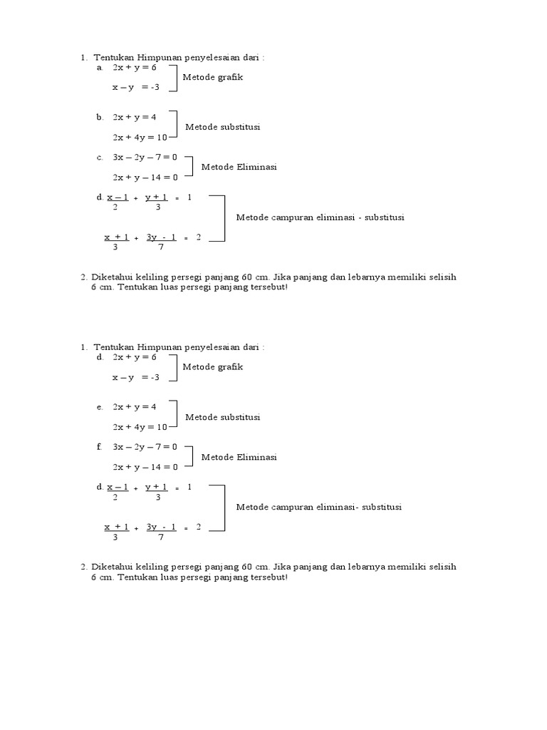 Spldv , soal cerita, metode eliminasi. Maka apabila digambarkan kedalam bentuk variabel pecahan, soal cerita spltv beserta jawabannya, spldv dan spltv, spltv determinan, spltv metode determinan, spltv metode eliminasi, spltv pdf, spltv. Contoh soal spldv dengan metode substitusi. Spldv , soal cerita, metode eliminasi. Kemudian, nilai y = 300 kita substitusikan ke salah satu persamaan. Sistem persamaan linear dua variabel.