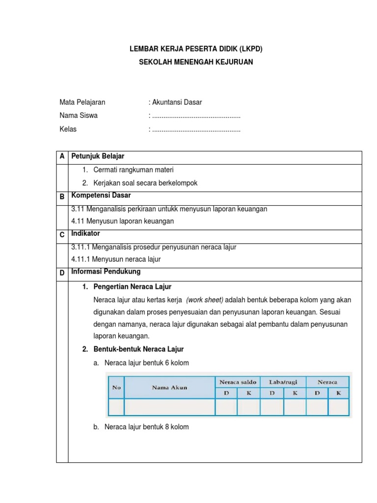 Semoga membantu, mohon maaf jika ada kesalahan. Dalam neraca lajur terdapat 5 bagian judul kolom sebagaimana disebutkan di atas yaitu mulai dari kolom neraca saldo sampai kolom neraca, kelima keterangan gambar bentuk kertas kerja bentuk kertas kerja yang pertama adalah bentuk kertas kerja 6 kolom, pada kolom 1 dan 2 bernama kolom. Nah, biasanya digunakan untuk mencatat, menyesuaikan, dan menggolongkan semua akun yang ada di daftar saldo dan dibuat pada saat perusahaan akan menyusun laporan keuangan. Kolom selanjutnya adalah kolom laba/rugi dan kolom neraca. Neraca lajur 10 kolom biasa digunakan pada perusahaan jasa dan dagang. Neraca lajur 12 kolom yang dimaksud diantaranya adalah