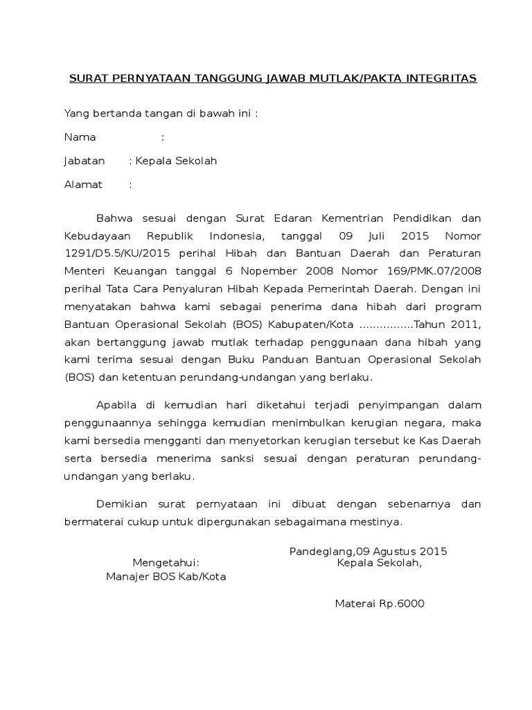 Contoh Surat Pernyataan Tanggung Jawab Mutlak Sptjm Contoh Seputar Surat from i0.wp.com Menyatakan dengan sesungguhnya bahwa saya bertanggung jawab sepenuhnya atas. Jadi jika anda diminta mengumpulkan fakta integritas maka yang dimaksud sekarang adalah sptm. Surat pernyataan biasanya dibuat oleh orang yang ingin menerangkan sesuatu agar bisa dipercaya oleh penerima surat. Berdasarkan peraturan menteri dalam negeri nomor 9 tahun 2016 tentang percepatan peningkatan cakupan kepemilikan akta kelahiran. Demikian surat pernyataan tanggung jawab mutlak ini saya buat untuk dapat digunakan sebagaimana mestinya.