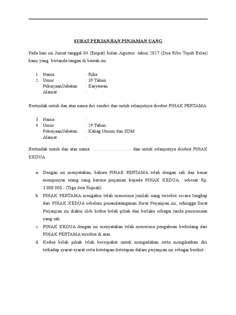 Surat perjanjian saat ini menjadi salah satu surat penting yang digunakan sebagai bukti adanya perjanjian antara satu orang dengan orang yang lainnya. Surat perjanjian saat ini menjadi salah satu surat penting yang digunakan sebagai bukti adanya perjanjian antara satu orang dengan orang yang lainnya. Ini termasuk jaminan yang diberikan oleh orang yang berhutang pada pemberi pinjaman. Saat membuat surat perjanjian hutang piutang, pastikan mengenal siapa orang yang berurusan dengan anda. Membuka usaha atau bisnis baru memang diperlukan banyak modal atau biaya. Pekalongan, 1 oktober 2015 kepada yth. Contoh surat:surat perjanjian pinjaman uangbahwa pada hari ini sabtu, 06 februari 2021, kami yang bertanda tangan di bawah ini setuju mengadakan perjanjian. Walaupun tidak segalanya dapat dibeli dengan uang. Pihak pertama berjanji akan melunasi uang pinjaman kepada pihak kedua dengan tenggang waktu selama 5 (lima) bulan terhitung sejak ditandatanganinya surat perjanjian ini. Ketika dua orang atau 2 instansi melakukan kesepakatan, biasanya akan diperlukan sebuah perjanjian atau jaminan untuk kepastian. Contoh surat perjanjian pinjaman uang tanpa jaminan. Contoh surat permohonan pelunasan ada banyak atau pihak yang menjadi peminjam/pihak berhutang, dan ada orang atau pihak yang memberikan pinjaman. Contoh surat perjanjian hutang dengan bunga.